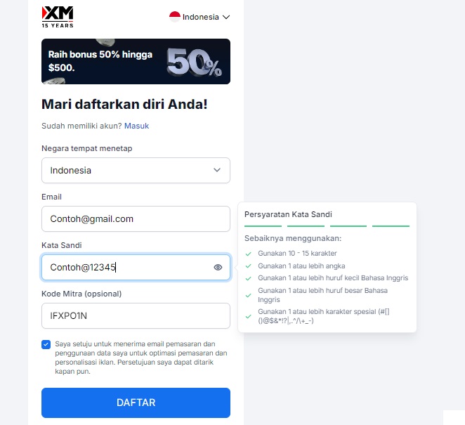 Silahkan isi form seperti contoh berikut dan agar tidak lupa kata sandi/password silahkan dicatat dahulu serta isi Kode Mitra: IFXPO1N