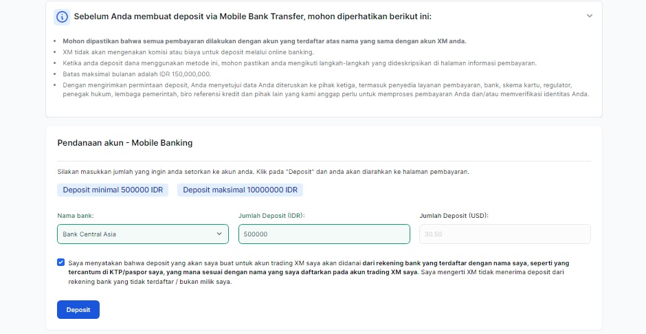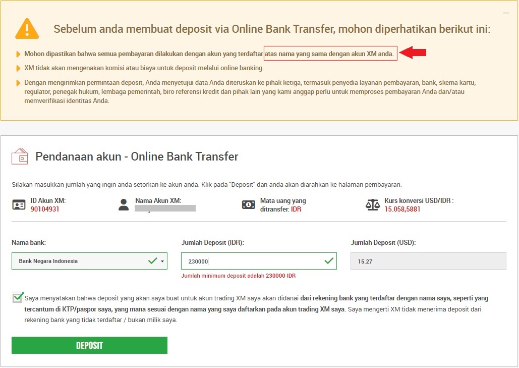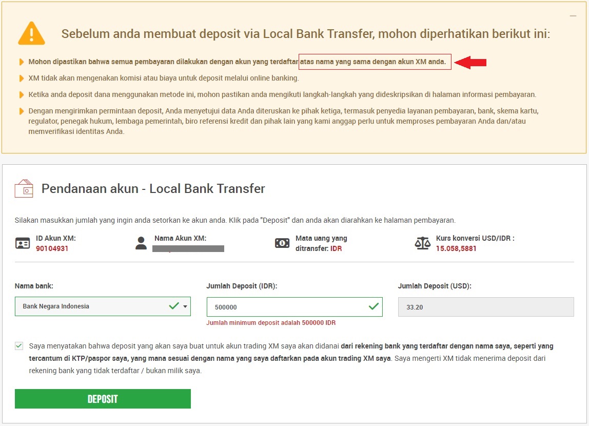 - Pastikan Nama Rekening Bank sama dengan Nama Akun Trading XM,