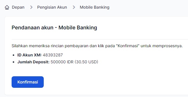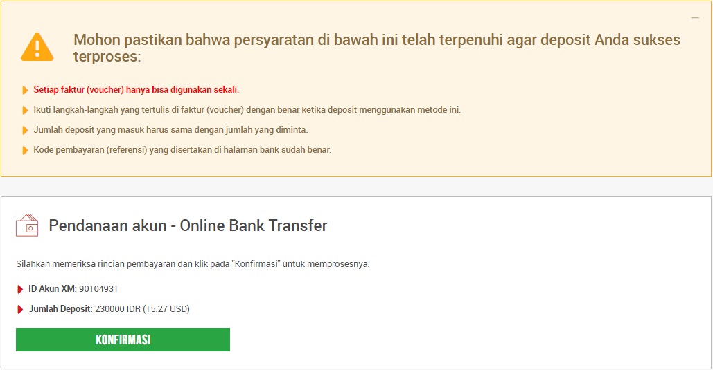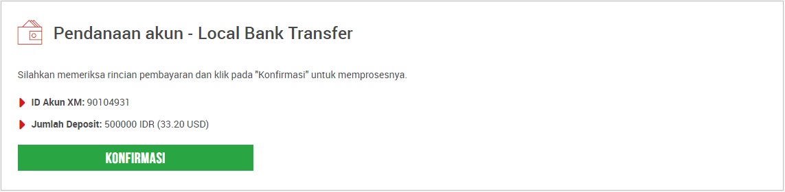 Pihak XM tidak menerima deposit dari rekening bank yang tidak terdaftar/bukan milik Anda atau beda nama. - Transfer deposit diproses secara instan atau hingga maksimal 24 jam, dihitung sejak Anda berhasil melakukan transfer.