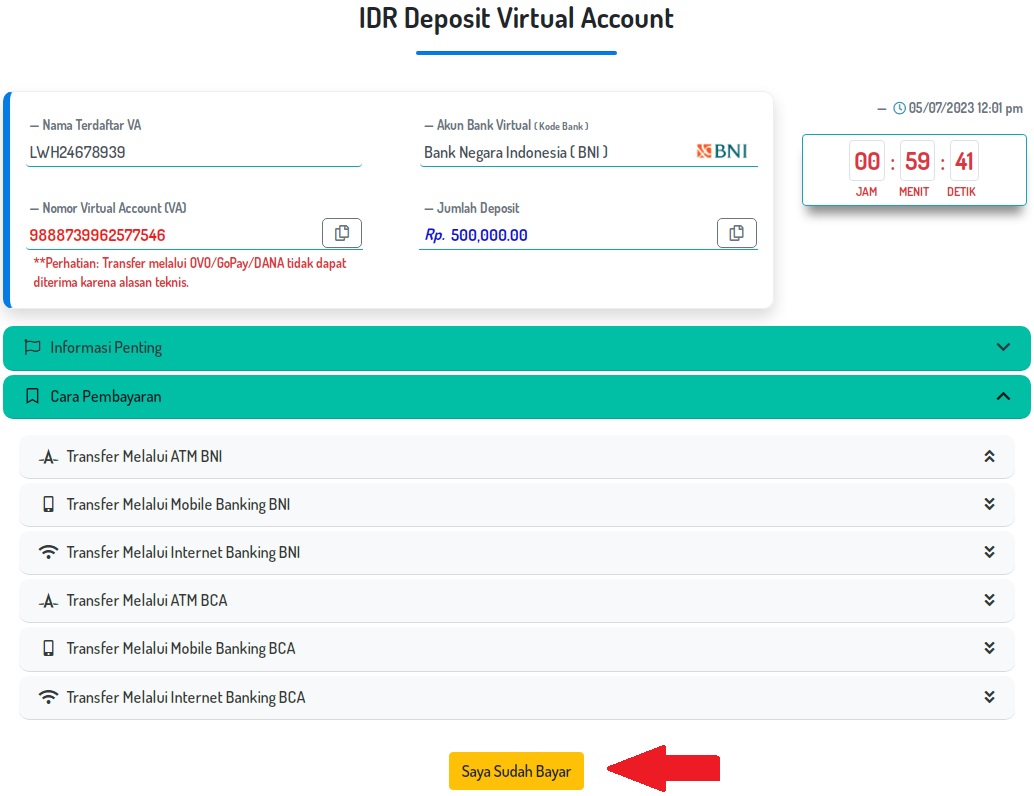 Bila sudah transfer silahkan klik tombol Saya Sudah Bayar.