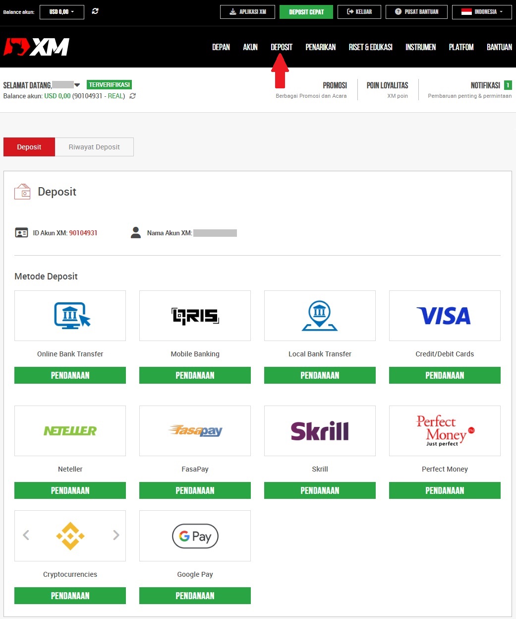 Setoran DanaJika Anda telah memiliki akun XM, dan akan melakukan deposit, Anda dapat melakukan deposit akun melalui halaman member area dengan akun yang sudah ada. Silahkan pilih salah satu panduan, sesuai dengan metode deposit.