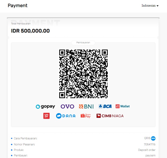 - Selanjutnya klik menu DEPOSIT, lalu pilih Metode Deposit QRIS (Minimal Deposit : Rp. 500.000,- atau setara $ 30 lebih sesuai rate/kurs)