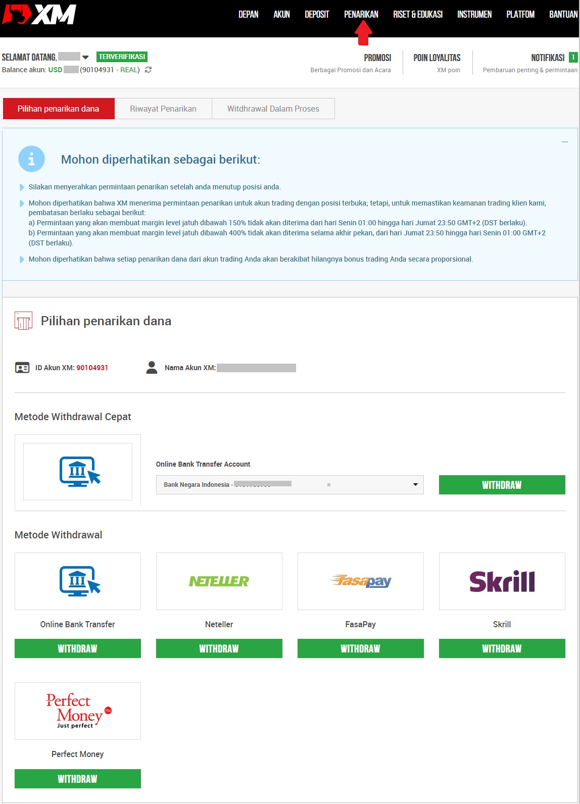 Penarikan DanaJika Anda telah memiliki akun XM, dan akan melakukan withdrawal, Anda dapat melakukan withdrawal akun melalui halaman member area dengan akun yang sudah ada.