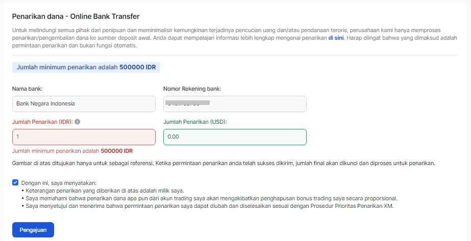 - Pastikan Nama Rekening Bank sama dengan Nama Akun Trading XM,