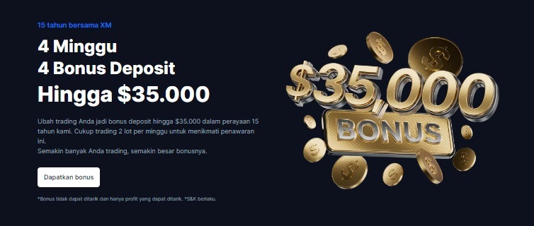 Ulang tahun ke-15 XM hadir dengan kejutan besar bagi Anda para trader! Nikmati Promo Exktra Bonus 100% + 50% Hingga $35,000 yang dirancang khusus sebagai bentuk apresiasi untuk klien setia. Tanpa syarat rumit, cukup trading seperti biasa dan klaim Bonus 100% + 50% di minggu berikutnya.