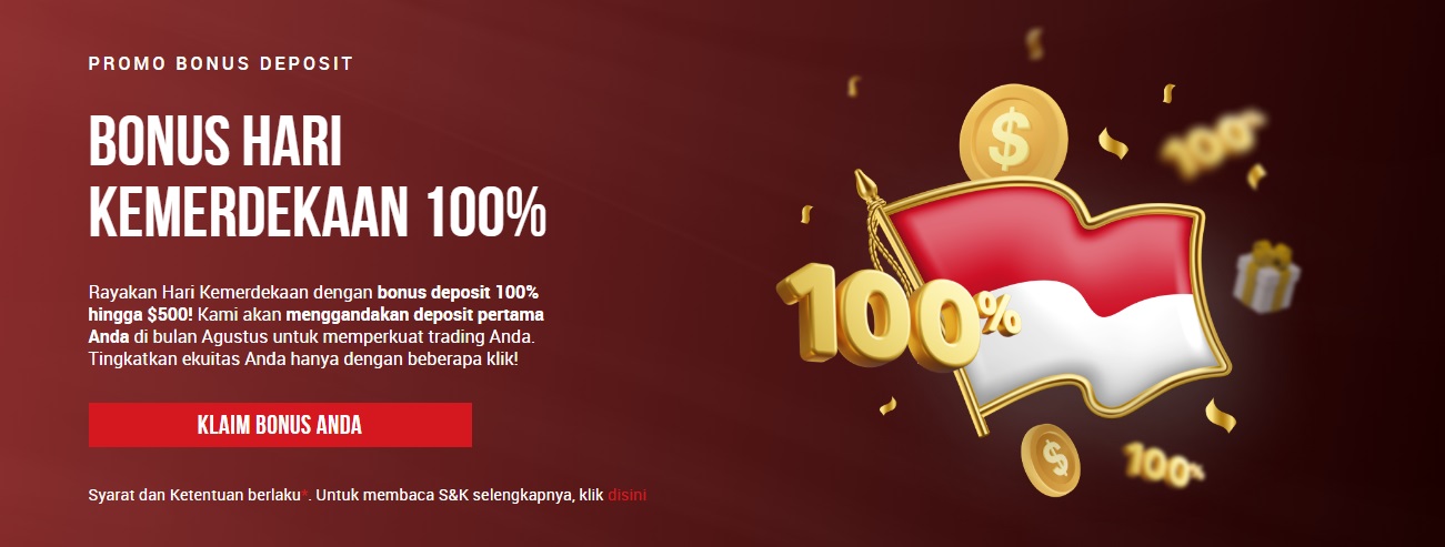 Rayakan Hari Kemerdekaan dengan bonus deposit 100% hingga $500!, Kami akan menggandakan deposit pertama Anda di bulan Agustus untuk memperkuat trading Anda. Tingkatkan ekuitas Anda hanya dengan beberapa klik!